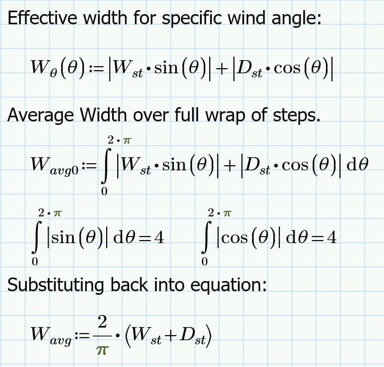 The steps of the stairway are rotating about the axis of the stack, and so the projected area of each step is slightly different. To calculate the effective width with of each step, we calculate the width for any wind angle, θ, as W(θ). We then use an integral to determine the average wind area, Weff, that can be used throughout the wind area calculation for the steps.